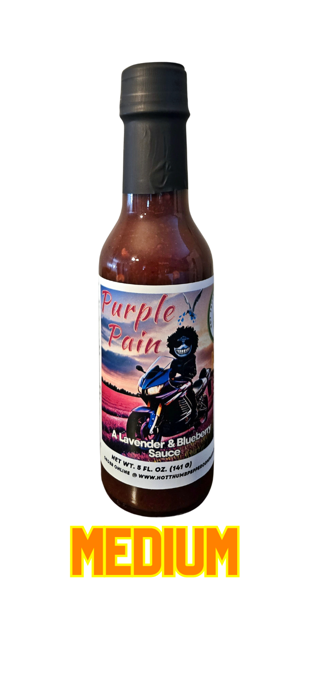 If you’re looking for a hot sauce that’s both flavorful and unique, look no further than Purple Pain. With lavender and blueberry, This medium/hot sauce is perfect for those who enjoy a little bit of heat in their meals, while also appreciating the subtle, light floral overtones that come with the infusion of lavender.